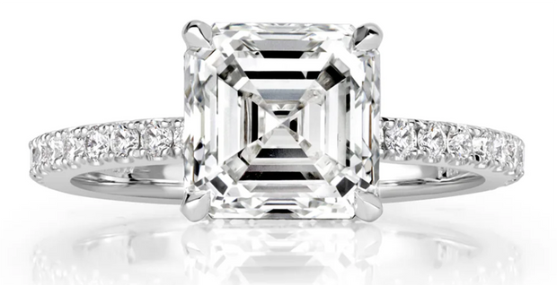 1. Colorless/white diamonds are color-graded in a face-down position, meaning the table (flat, top facet) faces down. Fancy colored diamonds are color-graded in a face-up position and will be certified with terms that range between Fancy Light and Fancy Deep. The gorgeous clear and rich emerald cut diamond engagement ring below is GIA-certified as Fancy Yellow, which is in the median range of color.
