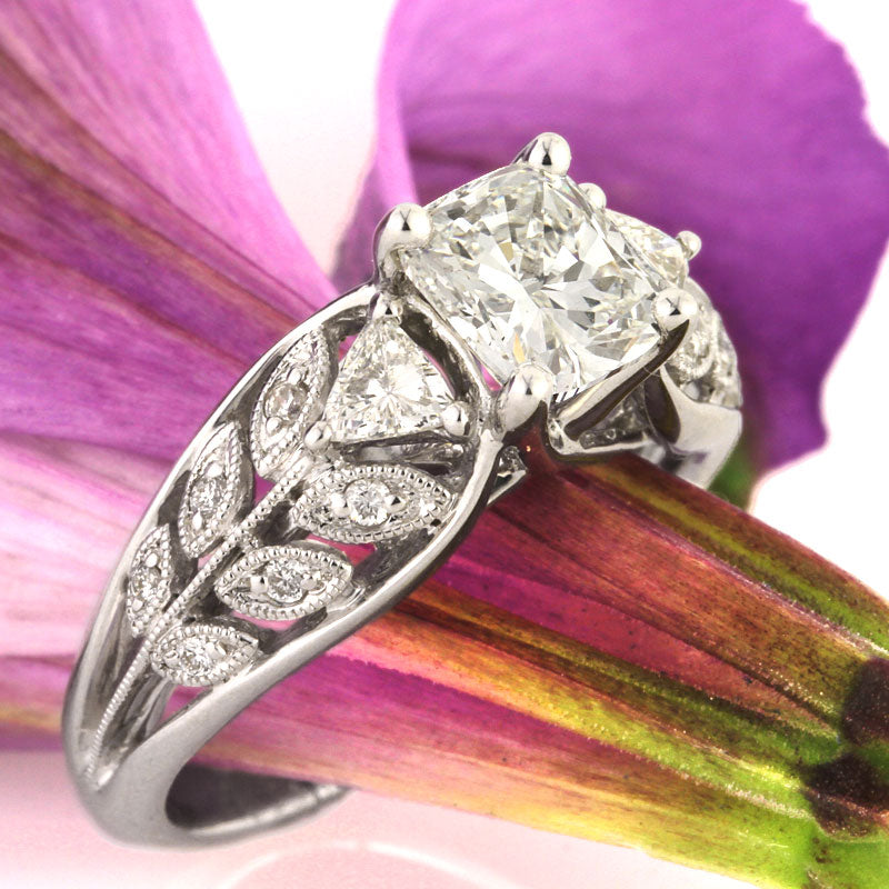 The stunning 1.21ct cushion cut diamond set in the center is GIA certified with a color of I and a clarity of VS2. It is white and incredibly clear and the outstanding cut highlights the tremendous fire and brilliance and visually improves the perceived size; it looks like a one-and-a-half carat diamond. A perfect complement of trillion cut diamonds flank each side of the cushion. A one-of-a-kind shank design features milgrain and round brilliant cut diamond studded leaves crafted from high polish 18k white gold.