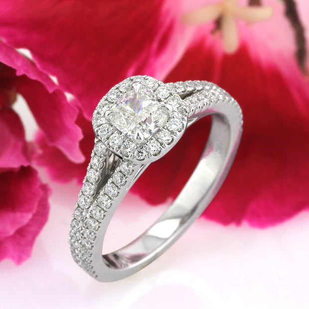 Not only is the radiant cut desirable in clear stones, but the mesmerizing facet patterns also enhance the natural color in fancy color diamonds. The beautiful 0.81ct cushion cut diamond set in the center of this 18k white gold designer setting is GIA certified with a color Fancy Dark Pinkish Brown and a clarity of SI2. The pinkish brown color is warm and rich and is enhanced by rose gold prongs. The stone was expertly cut and shines with much brilliance and vibrant color. This chocolate diamond is highlighted by a two-sided halo of white round brilliant cut diamond, micropavé set in a custom designed weaving rope detail that intertwines down the 18k white gold shank. The white gold setting and fancy color diamond creates a visually stunning contrast.