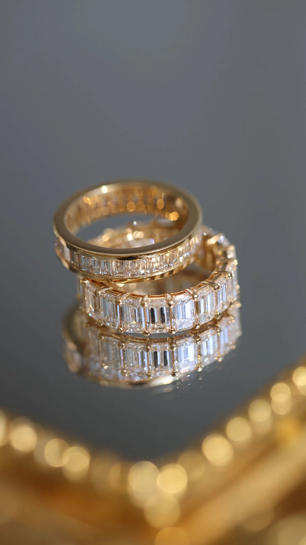 The eternity band, symbolizing eternal commitment, becomes a dazzling representation of a love that knows no end. Whether worn as a standalone piece or paired with an engagement ring, the emerald-cut diamonds in an eternity setting create a mesmerizing display of light and luxury.