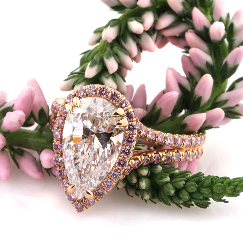 This one-of-a-kind, magnificent pear shaped engagement ring will leave you speechless! The astonishing 3.02ct pear shaped diamond set in the center is GIA certified at E-VVS1, exceptionally white and is actually a potentially flawless diamond as confirmed by GIA. It can be recut to make it flawless but it is so spectacular as is that we did not want to touch it! This ring is set in a custom-made rose gold setting featuring a halo of round brilliants set around the center and two rows of rounds set down the split shank in a micropavé setting. The diamonds are all natural fancy vivid pink diamonds that are exceptionally rare and almost impossible to find! The center stone reflects the pink diamonds and rose gold and truly warms the heart.