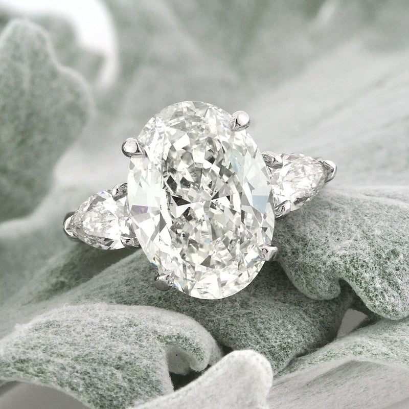 Celebrate your past, present and future with this regal and gorgeous three-stone diamond engagement ring. The center of this incredible piece is a 5.03ct oval cut center diamond, EGL certified at I in color with clarity of VS2. The masterful cut of this stone gives it tremendous light and brilliance. This oval cut diamond is nearly colorless and perfectly eye clean. Two large pear shaped diamonds flank the oval cut in a high polish 18k white gold setting. All diamonds are prong set, allowing more of the brilliance to shine through. The simple yet elegant design of this setting offers clean lines in a lovely tall profile. This ring is a unique combination to mark the beginning of your marriage or to celebrate your love as an anniversary ring.
