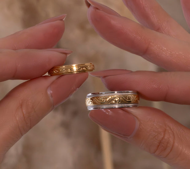 This enchanting design pays homage to the intricate detailing of vintage jewelry. At its midpoint shines a mesmerizing cushion cut diamond, exuding a soft glow. The vintage-inspired setting adds character to the ring, imbuing it with a sense of history.