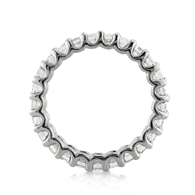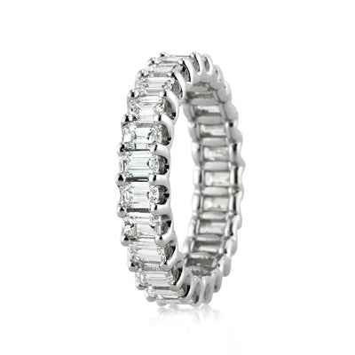 This mesmerizing emerald cut diamond eternity band has so much character and beauty! The gorgeous 3.00ct of perfectly matched emerald cut diamonds are hand set next to one another in high polish 18k white gold. The ”U” shape prongs showcase the diamonds beautifully with minimal metal showing. It is simple, amazing and extremely elegant. It looks exceptional paired with an engagement ring or worn on its own.