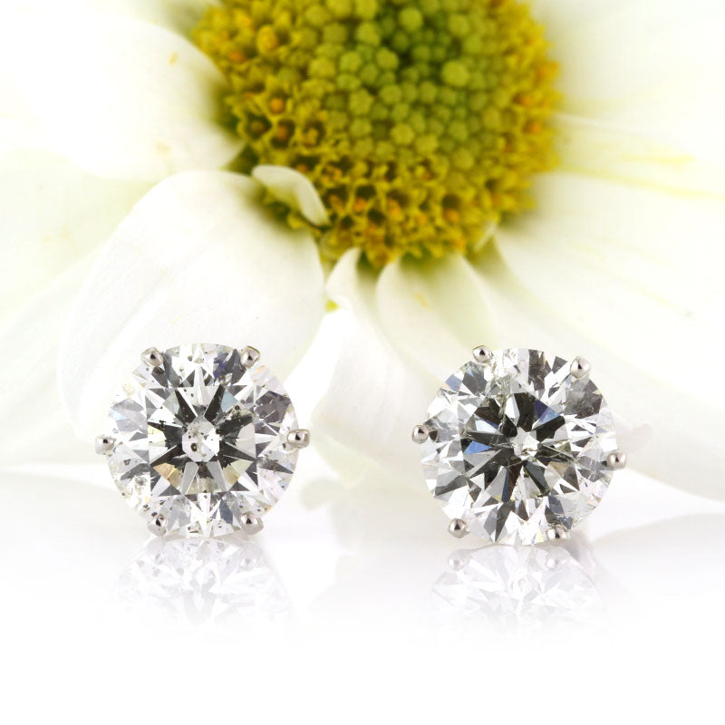 These gorgeous round brilliant cut diamonds make the perfect pair! The diamonds weigh 3.01ct and 3.02ct. They are both EGL certified at G-SI2. They are white and exceptionally brilliant! They are set on high polish 14k white gold screw backs featuring a six-prong setting design. We set them in a low profile so they sit very close to the ears. Mesmerizing for sure!
