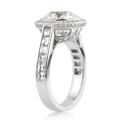 This phenomenally beautiful piece is one in a million! This exquisite 3.84ct old European round cut diamond is AGS certified at I-VS1. It faces up perfectly white and it is perfectly clear! The cut is truly breathtaking! The old European cut diamonds are faceted with larger, more pronounced facets that reflect light in an astonishing manner. It is breathtaking! The spectacularly beautiful and very unique custom-made platinum setting showcases the diamond in a bezel setting and has a halo of round diamonds pave set around it, accenting it perfectly! The shank is set with square step cut diamonds, also called carre cut diamonds in a channel setting. The astonishing center basket also features a row of carre cut diamonds channel set all the way around the basket with a row of round brilliant cut diamonds pave set on either side of it. The look is just awe inspiring! This one of a kind magnificent piece is sure to become a family heirloom you will cherish forever! Mesmerizing in every way!