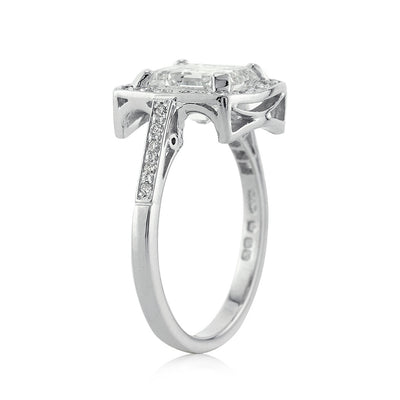 Satisfy your vintage desires with this emerald step cut diamond engagement ring. The 18k white gold setting showcases a 2.28ct Asscher-like cut center diamond EGL certified G-SI2, near colorless with minor inclusions. The cut is mesmerizing and allows for excellent brilliance. The over two carat diamond is encased in a halo of pavé set diamonds and there are also diamonds set down the dainty shank. For a big look and a great value, this is the ring for you.