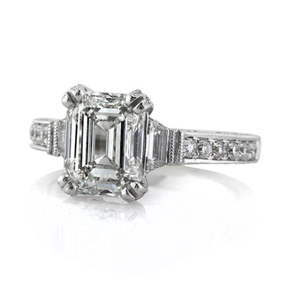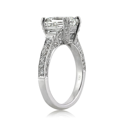 You will forever admire this exquisite three-stone emerald cut diamond ring designed and created to perfection. Showcased in the center is a 3.00ct emerald cut diamond GIA graded at I-VS1, very white and devoid of any visible inclusions. It possesses a desirable shape and the cut is extremely bright. The three carat center stone is flanked by two trapezoid cut diamonds and the basket it sits in is completely decked out in pavé round and baguette cut diamonds. With a vintage allure, the three-sided pavé shank perfects the engagement ring. Milgrain is added throughout the 18k white gold designer setting for a softer look. This beauty will be eternally classic.