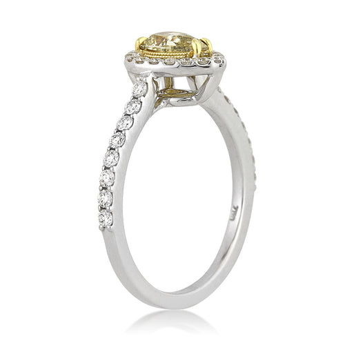 This gorgeous pear shaped diamond ring offers such a gorgeous combination at a great value! The 0.54ct pear shaped center diamond is GIA certified at Fancy Light Brown Green Yellow and has a clarity of I1. The diamond has a combination of colors but you only see a beautiful yellow when looking at it. It is accented by a halo of round diamonds and a row of round diamonds set down the shank in a shared prong setting design. The ring is made in high polish 18k white gold and features an 18k yellow center basket that is hand engraved. A beautiful ring you will love to show off!