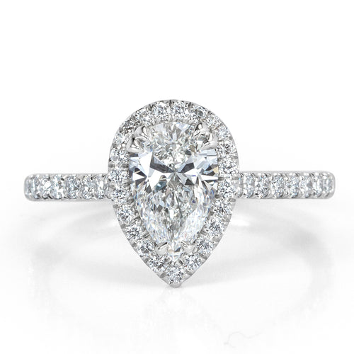 This pear shaped diamond halo engagement ring is stunning and of a great value! The centerpiece features a 1.03ct pear shaped diamond GIA certified at F-VS2. It is brilliantly colorless, perfectly eyeclean and measures at an incredible proportion of 8.94 x 5.53 mm. The mesmerizing one carat center diamond is beautifully accented by sparkling round brilliant cut diamonds set in a micropave setting around it in the halo as well as the sides. The underbasket is handcrafted with an intricately detailed filigree basket design which makes this piece extraordinarily unique. This piece is made in a luxurious platinum setting. It is a classic that she will cherish forever!
