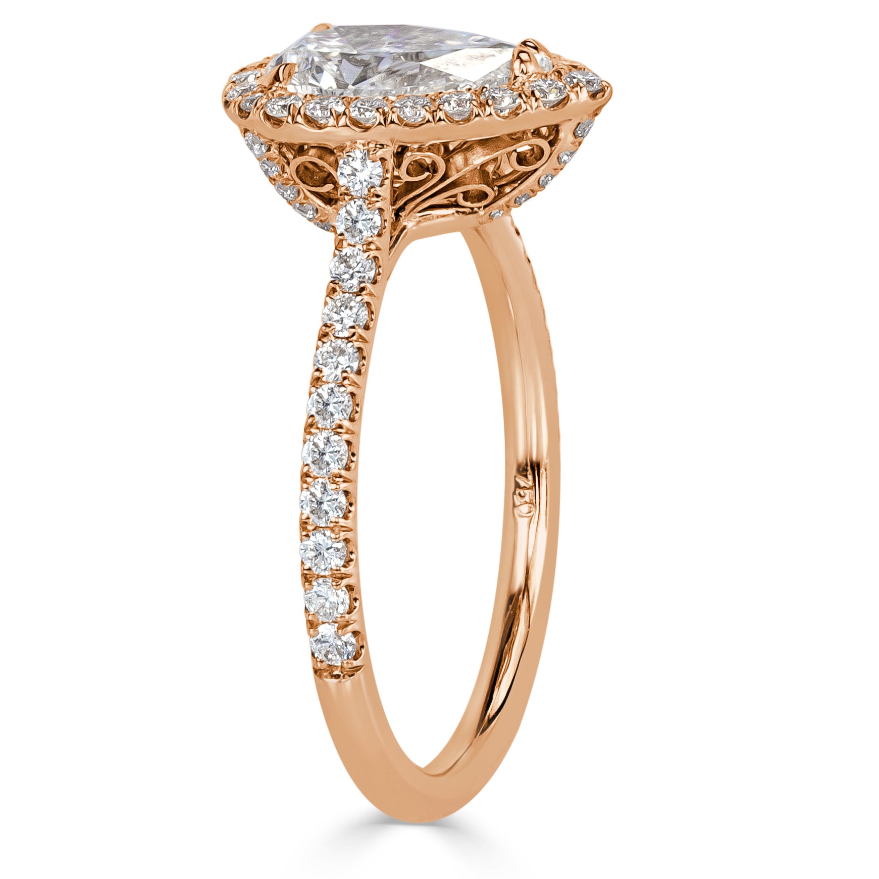 This pleasing pear shaped diamond engagement ring is delightful! Featured at the center of the 18k rose gold setting is a 1.01ct pear shaped diamond GIA certified at G-VS2. It is a beautiful white color and very clear. The shape is very desirable and the cut is perfect! The over one carat diamond is surrounded by a single micro pavé halo and a row of diamonds going down the shank. There are also diamonds and filigree on the basket for added detail.