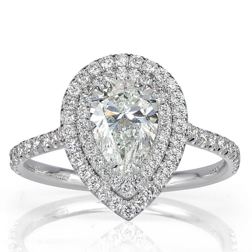 There is nothing truly as ravishing as this 1.01ct pear shaped diamond engagement ring. The gorgeous center diamond is GIA certified at H-SI1. You will not be able to look away from the fiery sparkle and perfect cut of this tear drop gem. Two shimmering rows of round brilliant cut diamonds outline the pear shaped diamond with flawless detail in a 18k white gold double halo setting. Brilliantly white side diamonds also stud the basket connectors and go down the shank, adding to the overall allure of the masterpiece. This beauty is sure to shine from miles away!