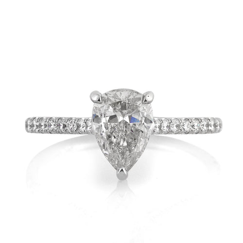 This spectacularly beautiful and brilliant pear shaped diamond engagement ring has such an outstanding combination and gives you tremendous value! e 1.18ct pear shaped center diamond is EGL certified, one of the leaders in diamond grading, at G-SI2. It is white and eye clean! It is accented by a row of round brilliant cut diamonds set down the shank in a micropave setting. The ring is made in high polish 18k white gold. Great piece at a great value!