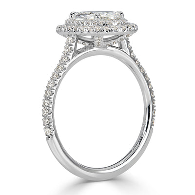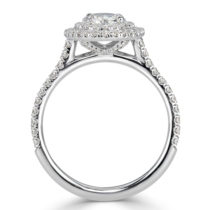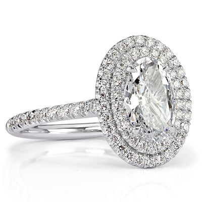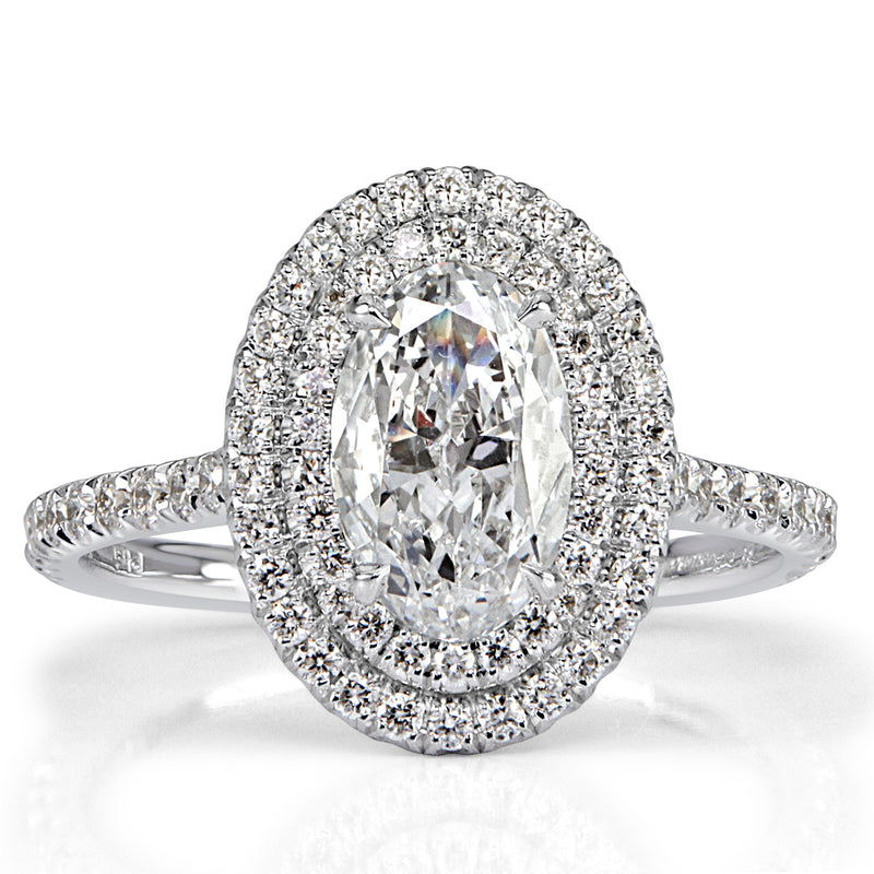 This feminine oval cut diamond engagement ring is truly stunning! It features a gorgeous 1.01ct oval cut center diamond GIA certified at E, SI1. It is very white and it measures a stunning 9.01 x 5.75 mm. It is accented by a double halo of round brilliant cut diamonds with sparkling diamonds adorning the center basket as well as the dainty 18k white gold shank. It sits on the finger beautifully and it is so brilliant! A timeless engagement ring you will cherish forever!