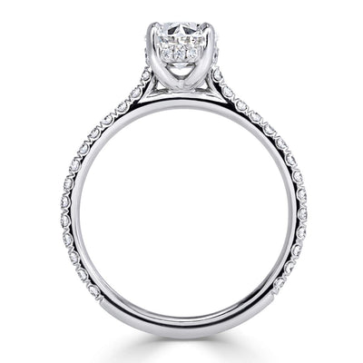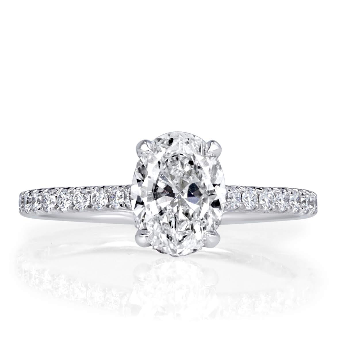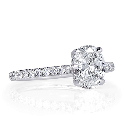 This platinum oval cut diamond engagement ring is elegant and dainty. This beauty features a 1.20ct oval cut diamond GIA certified at E-VS2. It is of a premium grading of colorless and is perfectly eyeclean. The remarkable cut allows for maximum brilliance and fire. The petite shank tapers up to meet the basket and is set with diamonds just past halfway. The additional round brilliant cut diamonds handset into the hidden halo adds an extra dazzling effect. Her jaw will drop when she opens the box to reveal this coveted treasure!