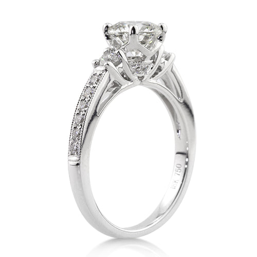 This gorgeous round diamond engagement ring has such an elegant and beautiful design! The stunning 1.02ct round brilliant cut diamond set in the center is GIA certified (one of the leaders in diamond grading) at I-SI2. It faces up perfectly white and eye clean! The cut is outstanding and it sparkles tremendously! It is accented by two round diamonds that are prong set on its sides and a row of round diamonds pave set down the shank. The center diamond is set in a very unique center prong and features small round diamonds pave set right underneath it for an added touch of brilliance. It is stunning! An amazing round diamond engagement ring at a great value!