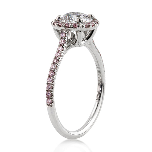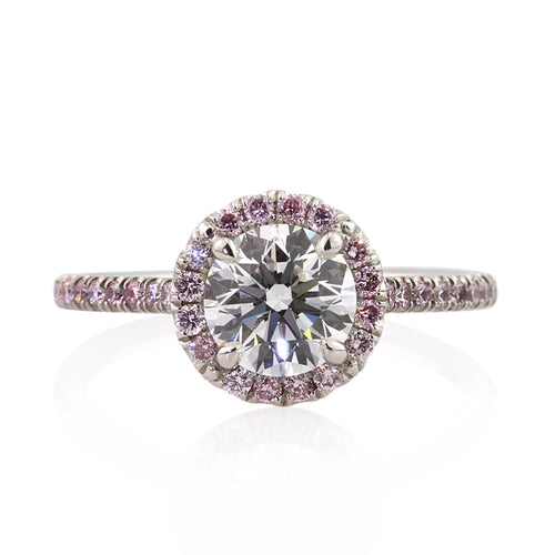 This enchanting round brilliant cut diamond engagement ring has one of the most incredible combinations you have ever seen. It all starts with the mesmerizing 1.07ct round brilliant cut diamond poised in the center. It is GIA Certified, one of the leaders in diamond grading, at E-VVS2. It is exceptionally white and practically flawless! It sparkles tremendously as well! It is accented by a halo and diamonds set down the shank in a micropave setting. the diamonds are all fancy intense pink. They are all super brilliant and very vibrant in color. You will love this exceptionally beautiful piece! One of a kind in every way!