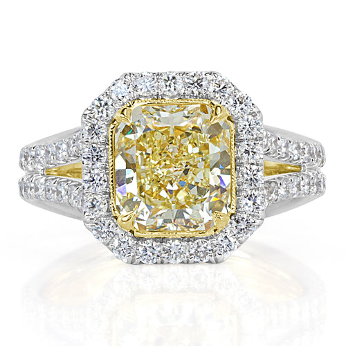 This gorgeous fancy light yellow pear shape diamond ring is simple, elegant and exceptionally beautiful! The stunning 1.73ct pear shape center diamond is accented by a halo of exceptionally white round diamonds. The shank is made smooth, rounded and solid. It is classic and modern all rolled into one. The center basket is hang engraved through out. Amazing from every angle!