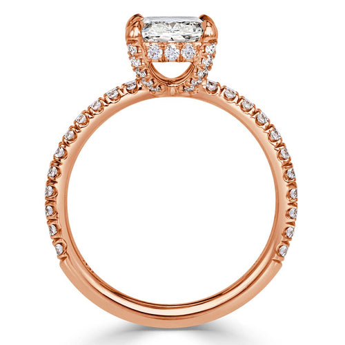 Antique old mine cuts are extraordinarily stunning and this one is no exception. The 1.24ct old mine cut center diamond featured in this engagement ring is GIA certified at I-VS1, beautifully white and perfectly eye clean. It is set on an exquisite 18k rose gold setting accented by round brilliant cut diamonds pave set on either side going halfway down the shank as well as on the delicate hidden halo. This elegant, handcrafted old mine cut diamond ring will absolutely stun her!