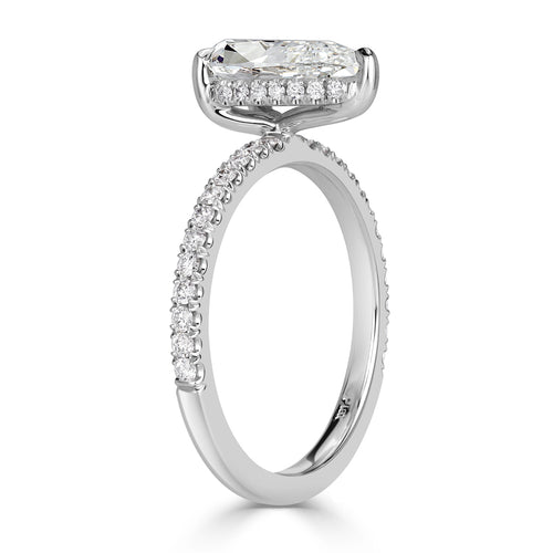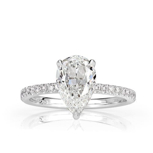 When it comes to quality, look no further than this beautiful 1.60ct pear shaped diamond engagement ring. Showcased at the center is this irresistible pear GIA certified at a remarkable D-SI1 grading. It has a superb cut and measures at an incredible proportion of 10.27 x 6.73 mm. With it's premium top color grading, this beauty faces up a crisp white and is perfectly eyeclean. Designed in a luxurious high polished platinum setting, this engagement ring features our signature hidden halo style which is the round brilliant cut diamonds set around the bottom of the center diamond. Additional diamonds are pavéset going down the shank of the ring for extra shimmer. Express your adoration for her with this phenomenal pear shaped diamond engagement ring.