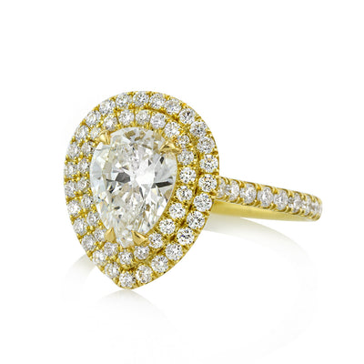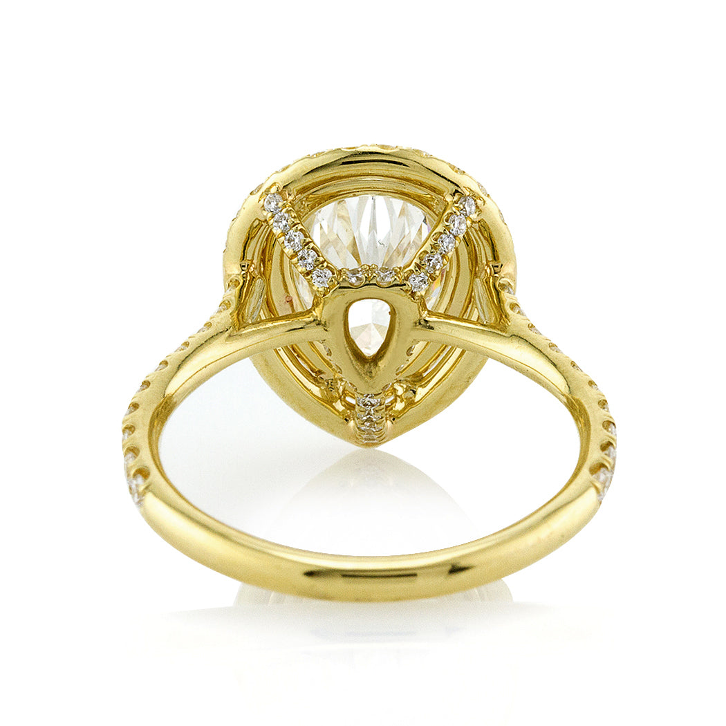 Say hello to perfection. This incredible pear shaped diamond engagement ring has balance, symmetry, and beauty. The 18k yellow gold setting is dainty and sits beautifully on the finger. The designer setting features a very attractive 1.19ct pear shaped diamond encased by two micro pavé halos and a diamond shank. The center diamond is GIA graded at H-VS1, near colorless with high clarity. The cut is exquisite allowing for maximum brilliance and the shape is the ideal pear shape. She will fall head over heels for her new ”precious.”