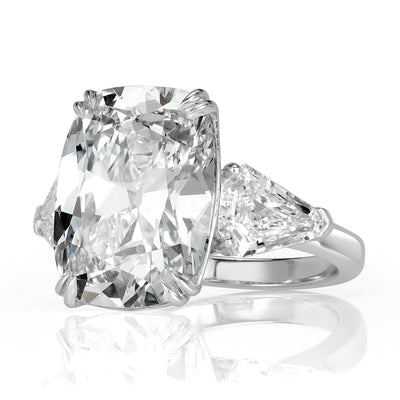 Designed with presence in mind, this three-stone old mine cut diamond engagement ring is stunning from every angle. The luxurious platinum setting showcases a breathtaking 10.31ct old mine cut center diamond that is GIA certified at H-VS1. This beauty radiates a beautiful white and is extremely clear. The ten carat center stone is handcrafted in a unique double-pronged setting and adorned with sparkling shield cut diamonds on either side. She will be mesmerized with this spectacular beauty on her finger.