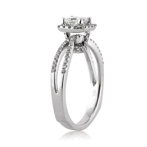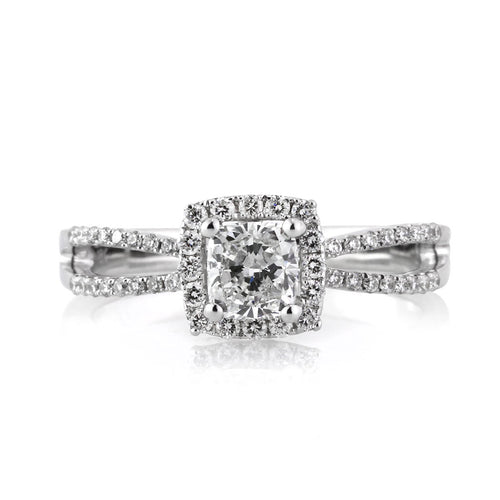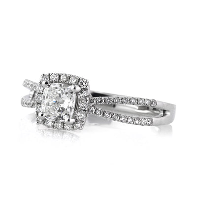 Dainty in nature and beautiful in design, this cushion cut diamond engagement ring looks amazing on the hand. It features a 0.60ct cushion cut diamond in the center. The cut of the diamond is magnificent, looking larger than most diamonds in the same carat weight range. It is accented by a halo of round diamonds. The shank features two rows of round diamonds and there are also diamonds set on the center basket. Leave her speechless with this dream ring.