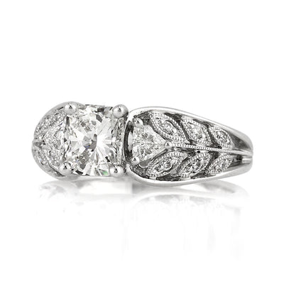 Sensational in every way! This gorgeous cushion cut diamond ring has such an amazing combination of quality and design. The stunning 1.21ct cushion cut diamond set in the center is GIA certified at I-VS2, white and very clear! The cut is outstanding! It has tremendous brilliance and looks like a one and half carat diamond! The beautiful setting features two trillion cut diamonds flanked on the sides with a leaf design down the shank set with round diamonds. The ring is made in high polish 18k white gold. The look is mesmerizing! You will love this piece!
