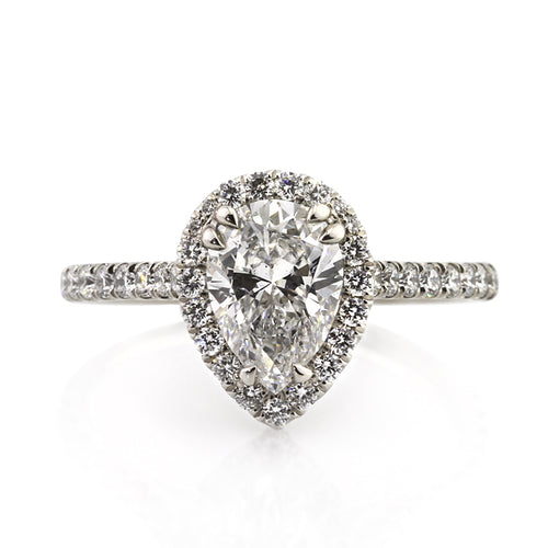 This exceptionally beautiful, simple and very elegant pear shaped diamond engagement ring will astonish you with its brilliance and beauty! The mesmerizing 1.25ct pear shaped diamond poised in the center is GIA certified (one of the leaders in diamond grading) at E-SI1, exceptionally white and very clear! The shape and cut of this pear shape is magnificently beautiful! It is set in high polish platinum and features a halo of round diamonds around the center and a row of round diamonds set down the shank. The center basket features gorgeous handmade filigree accents throughout with round diamonds studded in between. It is so exceptionally crafted and beautiful! You will love and cherish it forever!