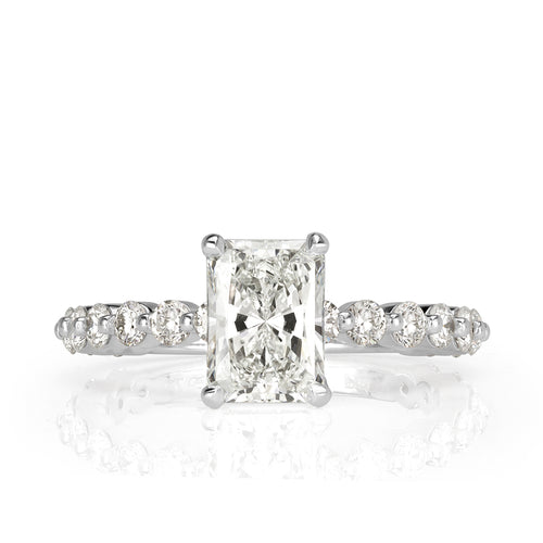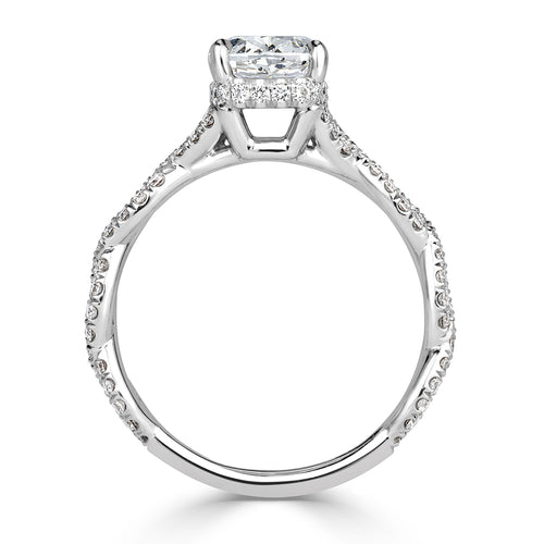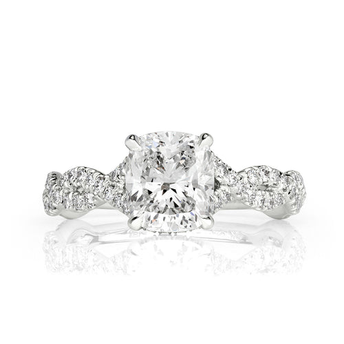 Beauty seeps out of this cushion cut diamond ring from every angle. It is handcrafted superbly in a high polished platinum setting. It showcases a gorgeous 1.50ct cushion cut center diamond that is GIA certified at E-SI2. This beauty faces up a crisp white and sparkles with immense fire. The ring features a dazzling hidden halo design accented with shimmering round brilliant cut diamonds and stems down to a feminine twist design down the diamond studded shank. Indulge in magnificent sparkle with this remarkable cushion cut diamond ring.