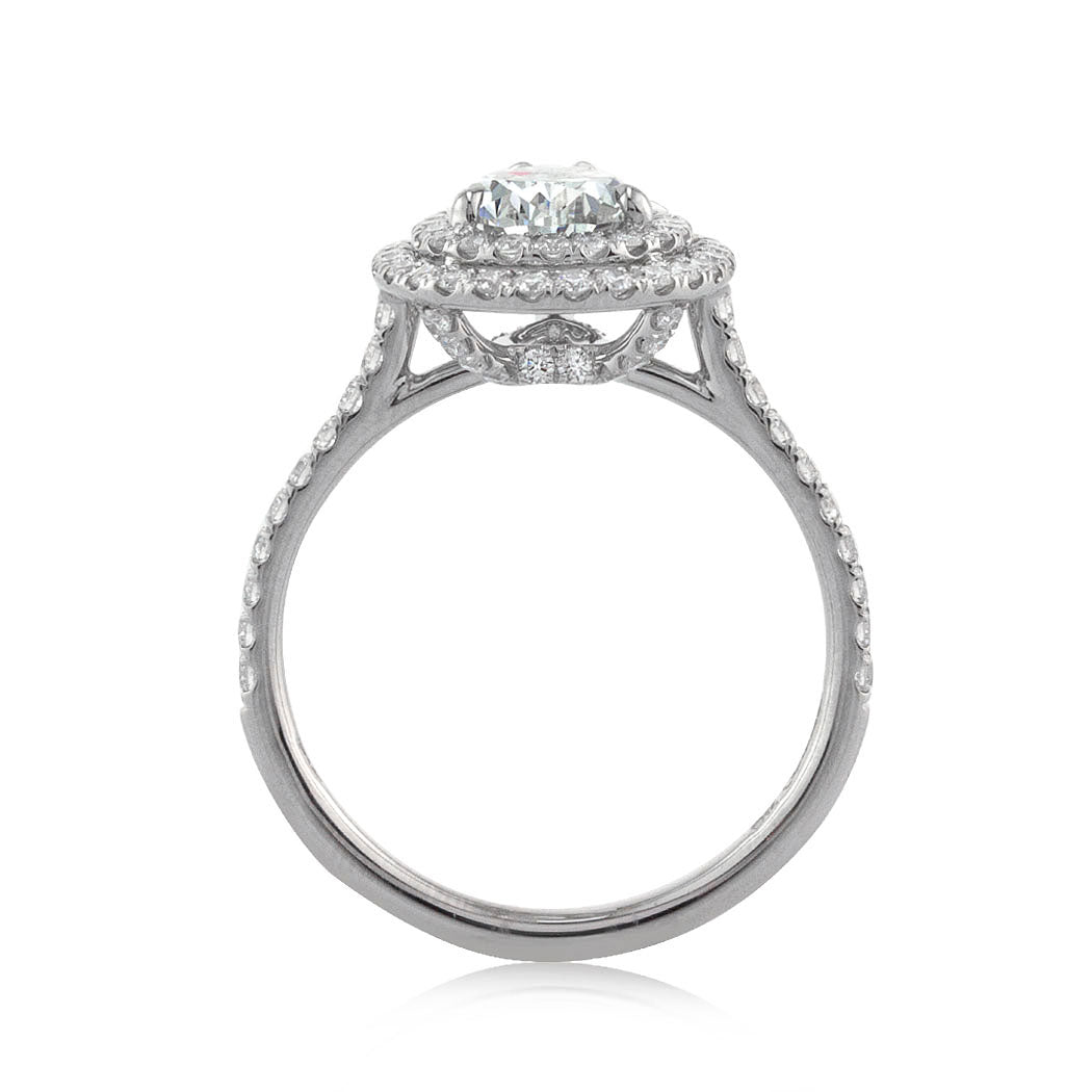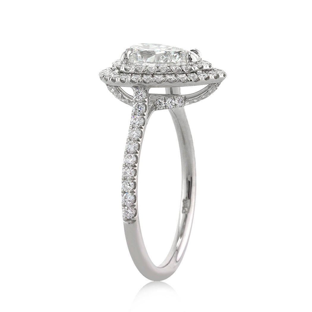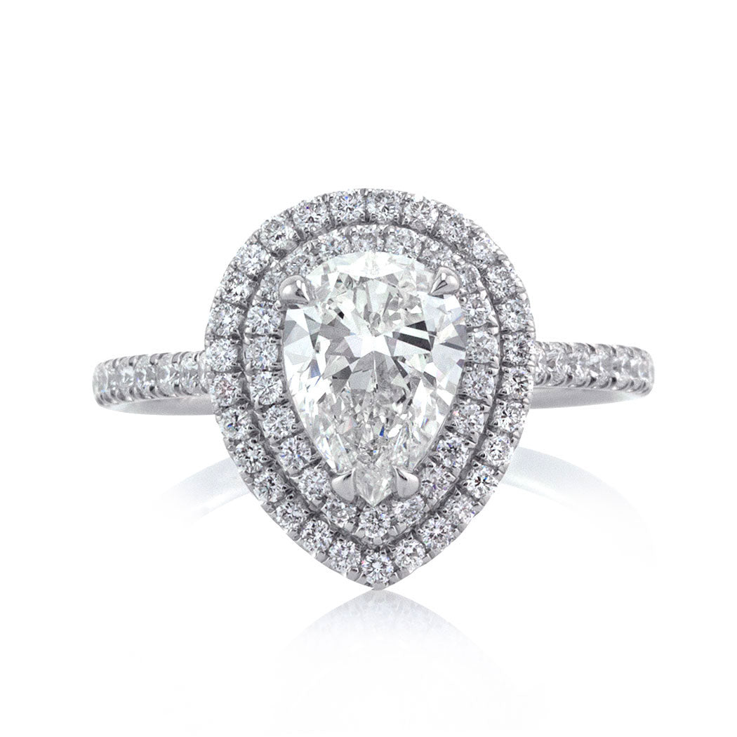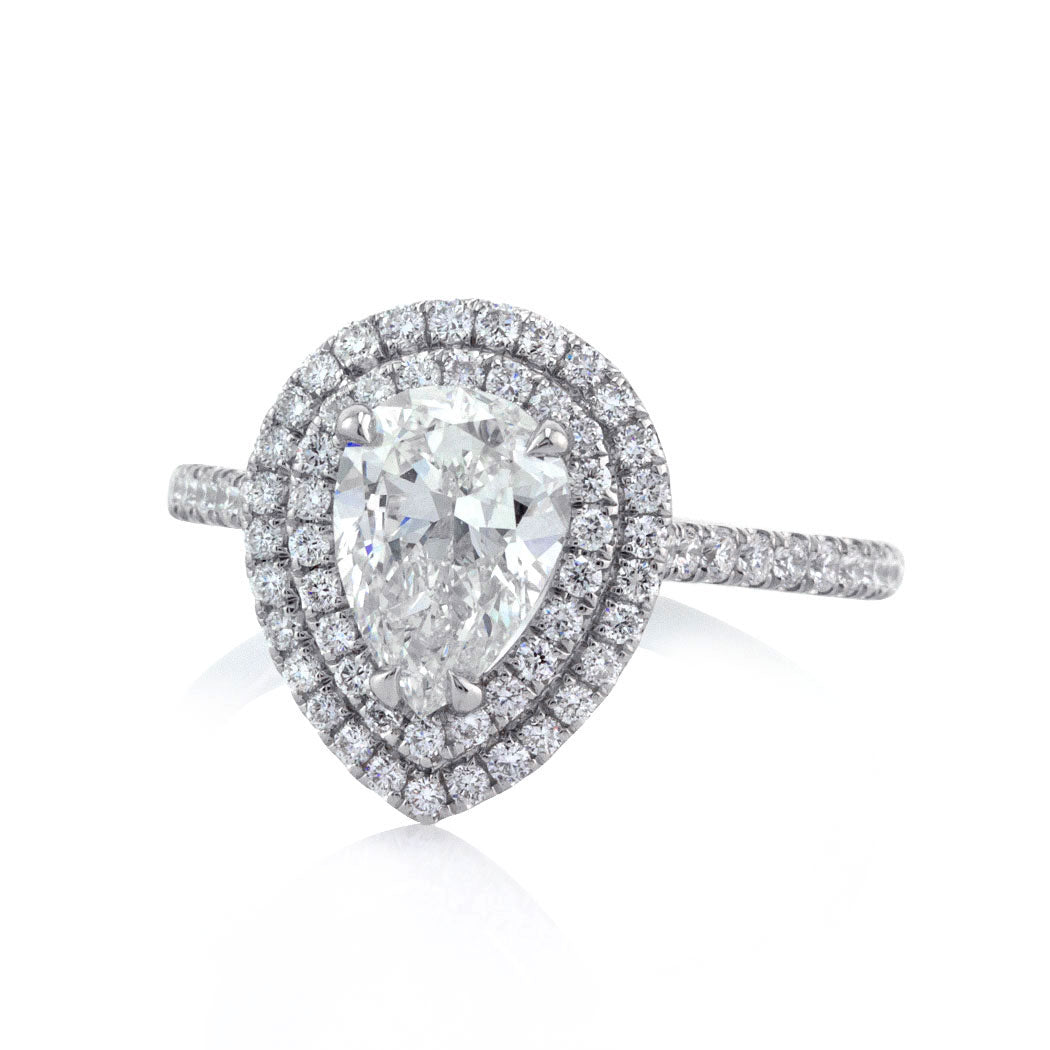 The perfect cut and tremendous sparkle on this 1.27ct pear shaped diamond engagement ring is nothing short of astonishing. This shimmering, well-proportioned pear shaped diamond is GIA certified at an exceptional I-SI1 grading. It is perfectly clear. The small white feather on this gem is hardly visible even under 10x magnification, giving you clarity comparable to a VVS stone! The custom designed platinum micropavé setting features a gorgeous double halo that gives you a larger look. It is accented by a dainty row of round brilliant cut diamonds on the shank as well as added detail on the connectors. She will not hesitate to say 'Yes' to this high quality, glamorous design!
