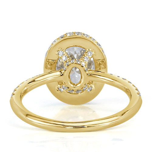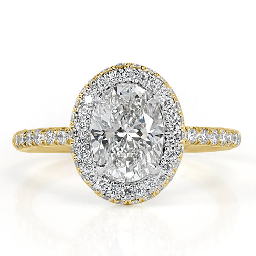 Brilliance, quality, and beauty all in one lovely ring! This oval cut diamond engagement ring is spectacular. It features a GIA certified 1.51ct H-VVS2 oval cut diamond that is surrounded by 0.65ct of round brilliant cut diamonds in a beautiful two-toned design. Bright diamonds glitter from all angles in our eternal micro-pavé style while adorning the two-sided halo, basket, and ring shank on this incredible piece. Expertly created with 18k white gold prongs surrounding the center stone and top halo for maximum shine, while rich 18k yellow gold completes the rest of the ring.  This piece is spectacular and sure to be cherished.
