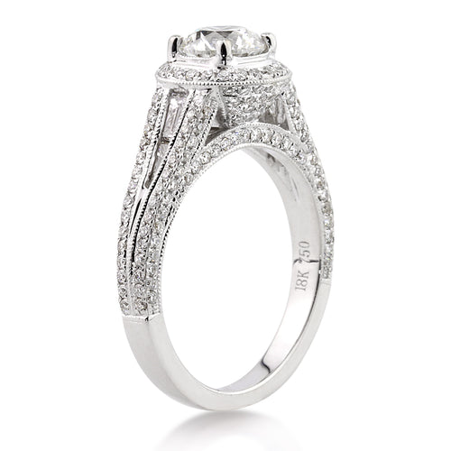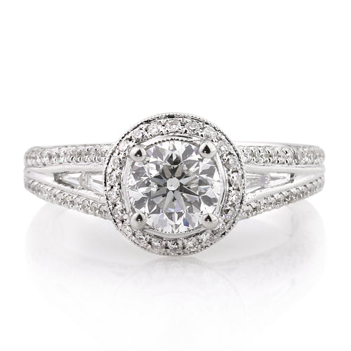 Exceptionally beautiful, incredibly detailed and super brilliant from every angle! This stunning round diamond engagement ring has it all! The 0.91ct round brilliant cut diamond set in the center is EGL certified at F-SI2, exceptionally white and perfectly eye clean! It is surrounded by a halo of round diamonds in a pave setting. The sides feature a split shank design that is studded with round diamonds and set with baguette cut diamonds in between them. The front and back of the ring as well as the center basket is also studded with round diamonds throughout which radiates with tremendous brilliance! Mesmerizing from every angle! It is sensational.