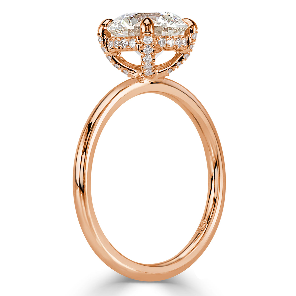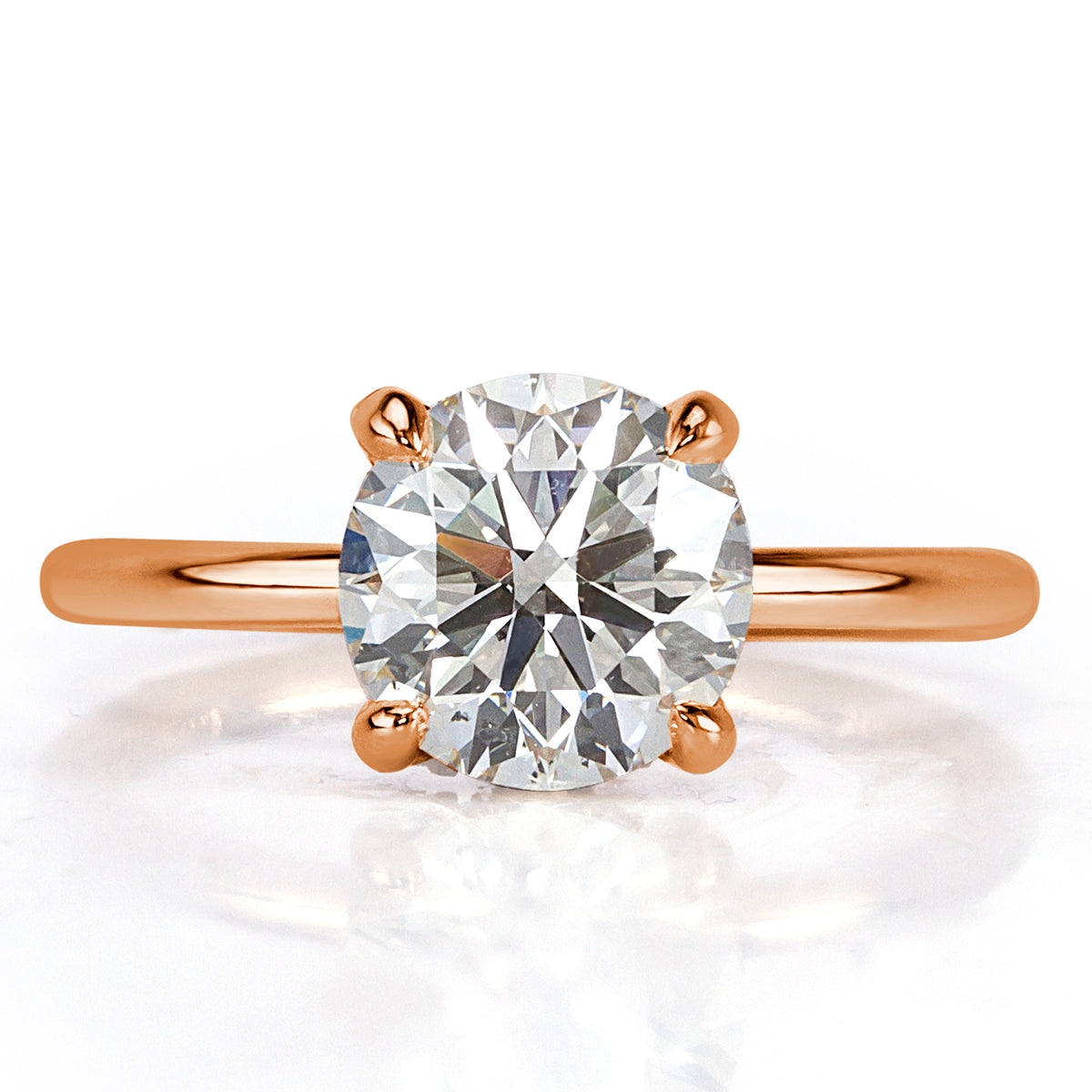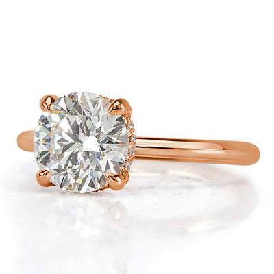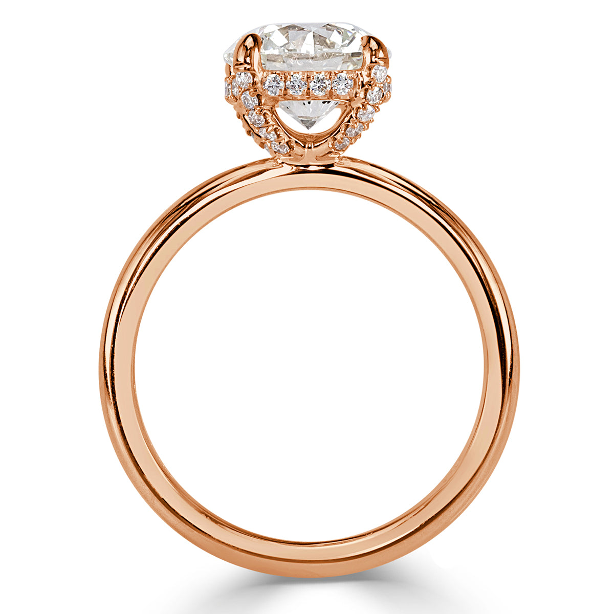 This 18k rose gold solitaire diamond engagement ring is truly a classic timeless! The centerpiece features a stunning 2.01ct round brilliant cut diamond GIA certified at L SI1. This beauty is additionally certified with a triple excellent grading which accentuates the ultimate sparkle that round brilliant cuts are renowned for. The round brilliant cut diamonds set in the hidden halo and basket connectors are a lovely surprise with additional shimmer added to the overall look. The ring's dainty design allows for the centerpiece to really pop and shine from miles away.