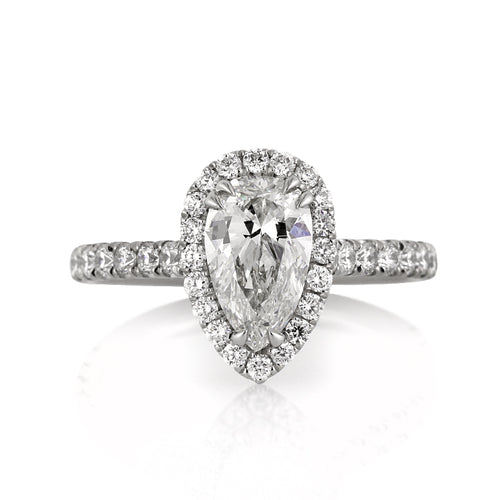 This gorgeous pear shaped diamond engagement ring will mesmerize you with its beauty, design, quality and brilliance! The 1.27ct pear shaped diamond is GIA certified at H-VS1. It is white and perfectly clear, even under 10X magnification. The cut is gorgeous as well and it sparkles tremendously. It is accented by a halo of round diamonds and a row of round diamonds set down the shank in a micro pave setting. The center basket is elegantly designed with handmade filigree accents and diamonds studded on the connectors. It is such a beauty from every angle! You will love it!