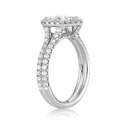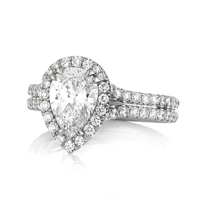 This exceptionally beautiful pear shaped diamond engagement ring will mesmerize you with its spectacular brilliance! The gorgeous 1.32ct pear shaped center diamond is GIA certified at D-SI2. It is exceptionally white, perfectly eye clean and the cut is remarkable! It has the most beautiful shape and it sparkles tremendously! The 1 carat diamond is surrounded by a halo of round diamonds and a split shank set with round diamonds in a micro pave setting. The center basket is studded with round diamonds as well. It is absolutely spectacular from every angle. All you see are diamonds! This platinum masterpiece is sure to be cherished forever!