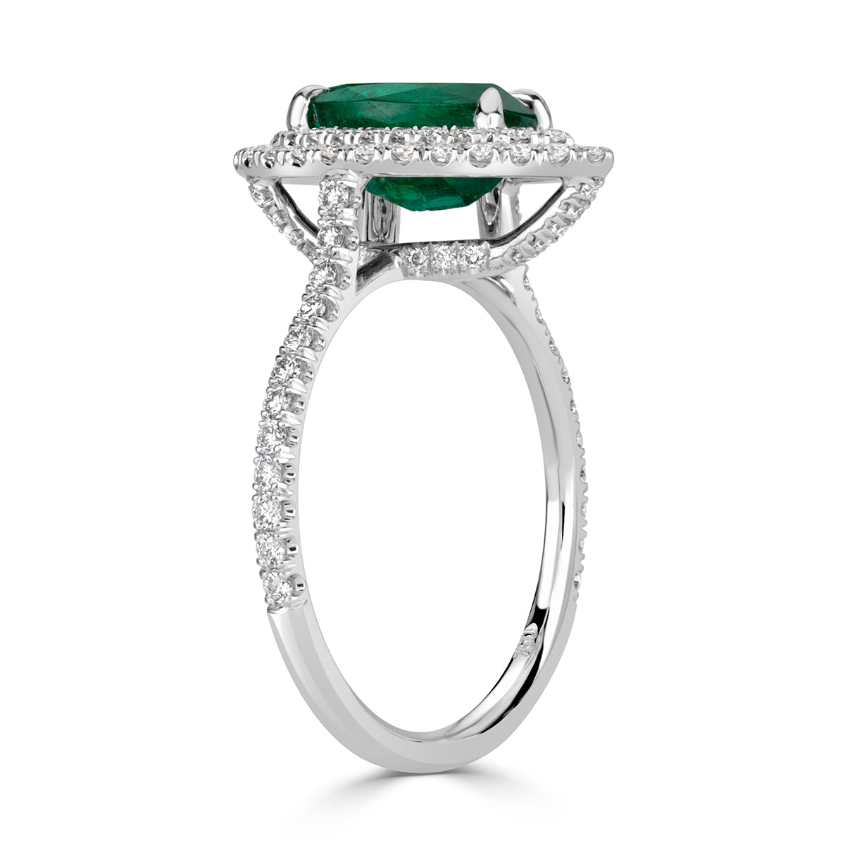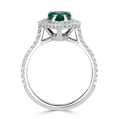 No detail was overlooked in creating this beautiful pear shaped emerald and diamond ring. This high polished 18k white gold setting showcases a 1.68ct GIA certified pear shaped emerald. This beauty displays a lovely elongated shape with tons of finger coverage. The centerpiece is adorned by a shimmering double halo design consisting of shimmering round brilliant cut diamonds. If she is seeking an elegantly chic look with a splash of color, then this remarkable emerald engagement ring is exactly what she's been looking for!