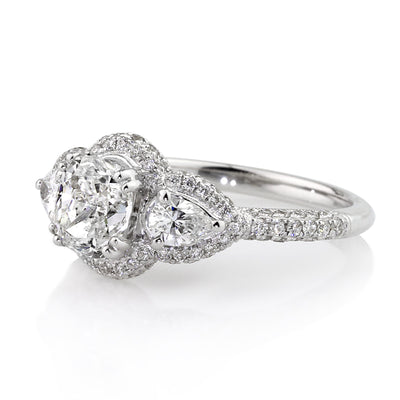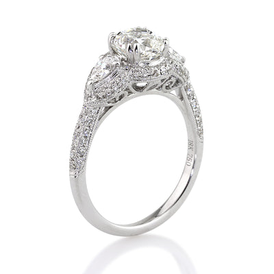 This mesmerizing cushion cut diamond ring has an outstanding combination of quality, craftsmanship and exceptional design all at an outstanding value. The 1.51ct cushion cut diamond is IGI certified at H-SI1, white and perfectly eye clean. The cut is gorgeous and it sparkles tremendously! It is flanked by two stunning pear shaped diamonds with a halo of round diamonds set around them. The shank is set with three rows of round diamonds in a micro pave setting. The center basket is unique and beautiful with filigree design accents. A mesmerizing piece you will cherish! Get ready for the compliments.