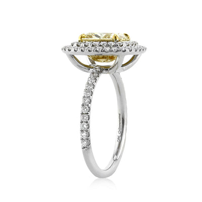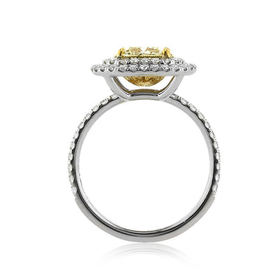 Indulge in fantastic finger coverage with this incredible double halo cushion cut diamond ring. At the heart of this micro pavé diamond and platinum setting is a 2.04ct cushion cut diamond GIA certified at Fancy Yellow-SI2 with delicious, rich color and good clarity. The great cut allows for an exciting amount of brightness and sparkle. As extra detail, diamond are added on the rounded shank just past halfway. Bring tears to her eyes with this gorgeous canary cushion cut diamond ring.