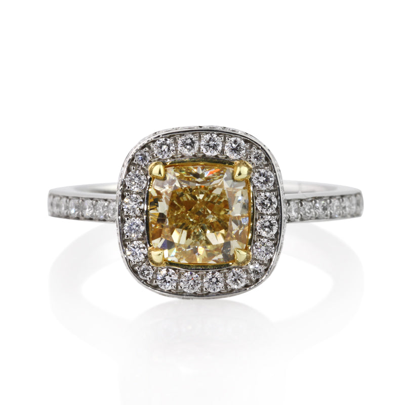 This gorgeous fancy yellow cushion cut diamond ring has such an awesome combination of quality, design and craftsmanship! The mesmerizing 1.51ct cushion cut diamond set in the center of this custom made platinum ring is GIA certified (one of the leaders in diamond grading) at Fancy Yellow VS2. It has a rich and beautiful fancy yellow color and it is very clear! The cut is gorgeous and it sparkles tremendously! It is accented by a halo of round diamonds set around it in a pave setting. The sides of the halo are also set with a row of round diamonds. The shank features a row of round diamonds set three quarters of the way down the shank in a pave setting as well. The very unique and beautiful center basket features an 18K yellow gold basket that is hand engraved to perfection. We also added hand made filigree accents in the basket with round diamonds studded around them for an added touch of beauty! You will be in awe when you see this exceptional piece in person!