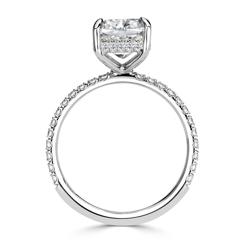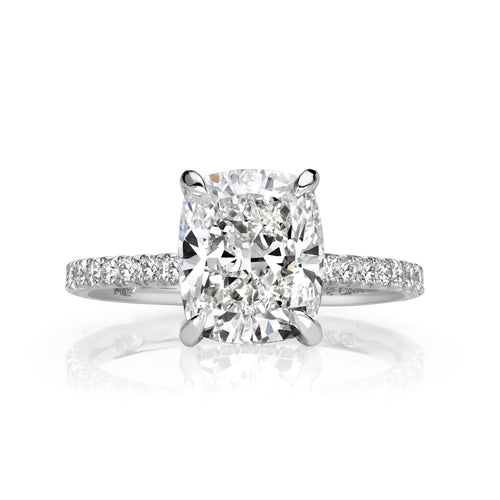 This extraordinary cushion cut diamond engagement ring is nothing short of jaw dropping! The beautiful 3.02ct cushion cut center diamond is GIA certified at H-SI1. It has a crisp white color, is exceptionally clear and looks more like a VS+ diamond. This beautifully elongated cushion measures an outstanding 9.37 x 7.80mm. It has an incredible cut and spectacular proportions. It is also graded excellent for polish and symmetry. A shimmering platinum setting showcases the center stone beautifully, with a row of round brilliant cut diamonds set down the shank. A stunning hidden halo adds additional sparkle. This diamond engagement ring is sure to make a lasting impression, and be cherished for generations to come.