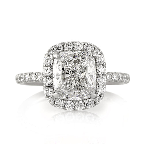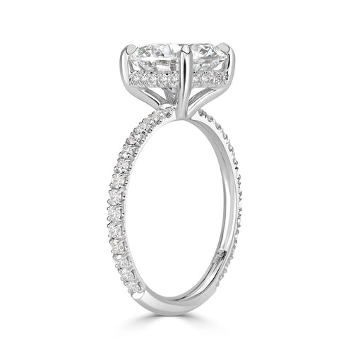 No detail was over looked with this gorgeous round brilliant cut diamond engagement ring. The centerpiece of this design features a sparkling 3.01ct round brilliant cut diamond GIA certified at I-VS1. It is exceptionally white, super clean, and immensely brilliant. It measures at an amazing proportion of 9.44 mm and is certified at the top grading of excellence for cut, polish and symmetry. The three carat center stone is adorned by a chic hidden halo design shimmering out from below. For additional sparkle, the platinum shank is also studded with diamonds pavéset 3/4 of the way down the band. This elegant round brilliant cut diamond ring is sure to capture the eyes of any onlooker.