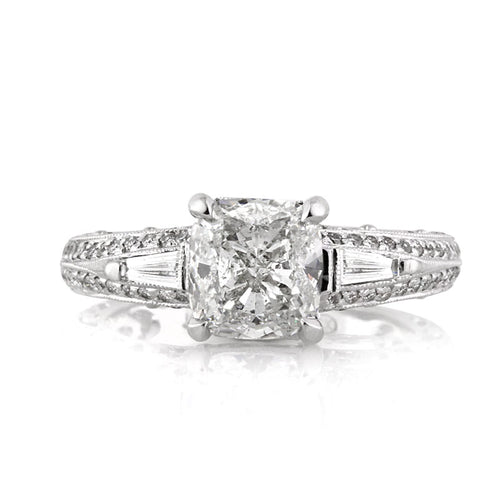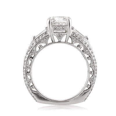 This spectacular cushion cut diamond engagement ring leaves nothing to the imagination with its amazing design. The phenomenal 2.51ct cushion cut diamond poised in the center is EGL certified at F-SI1. It faces up a brilliant white and the cut is full and lovely. The large two and a half carat center stone is flanked by two baguettes and two rows of pavé set round brilliant cut diamonds set all the way down the Euro shank. From the side view, the gallery design is embellished with milgrain throughout and is simply stunning. A matching wedding band can be custom created for this 18k white gold engagement ring. Intricate design, large size, and true quality---this cushion cut diamond engagement ring has it all!