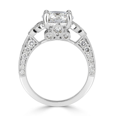 This stunning round brilliant cut diamond engagement ring is truly spectacular. The incredible 2.54ct round brilliant cut diamond featured in the center is GIA certified at D-SI2. The two and half carat center diamond is colorless and very brilliant. It is set on a custom, platinum setting and is flanked by a trio of bezel set round diamonds on either side and front and back. The shank is set with pavé diamonds on all three sides, sparkling from every angle. This very elegant round brilliant cut diamond ring will capture compliments in any room.