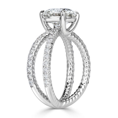 This chic round brilliant cut diamond engagement ring is flattering on the hand. The 2.75ct round brilliant cut diamond featured in the center is GIA certified at H-VS2. It faces up a crisp white and is perfectly eye-clean. This beauty is set atop an 18k white gold shank that crosses at the bottom for an open shank appearance. Sparkling white diamonds are micro pavé set on a finely detailed rope design on the shank. This round brilliant cut diamond ring will absolutely capture her heart!