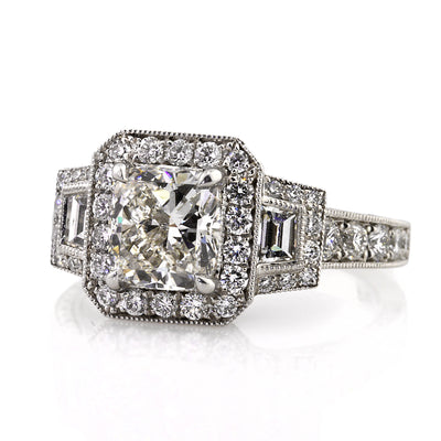 This remarkably beautiful cushion cut diamond engagement ring is one in a million! This custom made platinum ring is set with an astonishing 1.51ct cushion cut diamond in the center. It is GIA certified at H-VS2, white and perfectly clear! The cost is outstanding! It sparkles tremendously. It is flanked by two beautiful step cut trapezoid diamonds with a row of round diamonds pave set around each of them. The shank is also pave set with round diamonds on all three sides. The center basket features a handmade filigree design with a round diamond studded in the center for an added touch of beauty! It is spectacularly beautiful from every angle! A piece you will cherish forever!