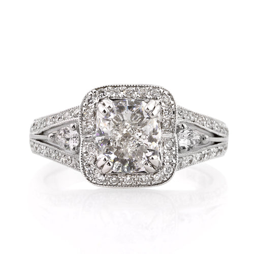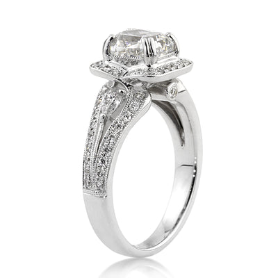 Spectacular brilliance, a gorgeous deign and phenomenal diamonds! This cushion cut diamond engagement ring features a stunning 2.02ct cushion cut diamond in the center. It is EGL certified (one of the leaders in diamond grading) at D-SI1. The best, whitest color diamond you can get and perfectly eye clean! It has a chunkier style cut to it which is reminiscent of the older antique cushions. It is so beautiful! It is accented by a halo of round diamonds set around it in a pave setting . The split shank is studded with round diamonds as well and features a large pear shaped diamond set in between them. There is also a small surprise round diamond bezel set on either side of the ring, right underneath the center that adds to its unique design and beauty. It is such an amazing piece at an outstanding value! Your going to get compliments daily!