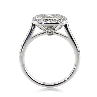 This is one of the most exceptionally beautiful cushion cut diamonds you will ever see! This extraordinary 2.04ct cushion cut diamond is GIA certified (one of the leaders in diamond grading) at G-VVS2, perfectly white and practically flawless! It has an outstanding cut. The facets are crisp, clear and beautiful! It sparkles tremendously! It is bezel set in the center and features a halo of round diamonds pave set around it and a row set down the shank in a pave setting as well. The center connectors are studded with round diamonds and lead to a single stone bezel set on either side of the ring right underneath the center. It is an exquisite piece! Simple, elegant and extremely beautiful. A piece you will cherish forever!