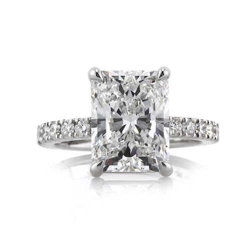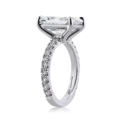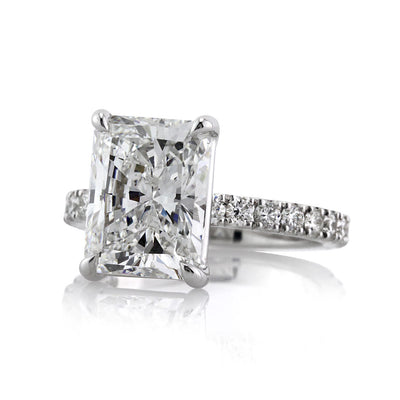 This incredible radiant cut diamond engagement ring is stunning from all angles! The 4.29ct radiant cut center diamond is EGL certified at F-SI2. It is colorless and has amazing brilliance. The four carat center stone is set atop a custom 18k white gold setting with diamonds going three-quarters of the way around in micro pavé setting. Capture her heart forever with this radiant ring!