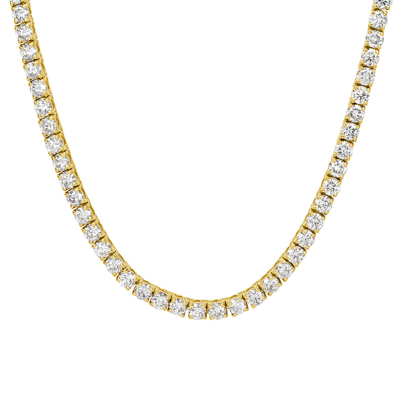 You will never want to take off this 11.88ct round brilliant cut diamond tennis necklace. The glistening diamonds are perfectly matched at a H-I, VS2-SI2 grading and display tremendous fire and brilliance. These eye-clean stones are set in a beautifully bright 14k yellow gold. Stand the test of time with this beautifully refined diamond necklace handcrafted at 16.5”.
